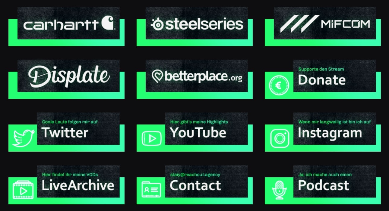 Dazu gehört schon die Möglichkeit zur ersten Kontaktaufnahme. Hast Du eine Business-Mail und kontrollierst diese regelmäßig? Sehr gut. Ist diese Adresse leicht zu finden, beispielsweise in der Beschreibung Deines Streams oder auf all Deinen Social-Media-Kanälen? Noch nicht? Dann wird es Zeit. Leg Dir ein passendes Overlay zu, das zum Teil Deiner Marke wird. Diesen Style übernimmst Du in alle Bereiche. Neben einer kurzen Vorstellung, den Chat-Regeln sowie Deinem Schedule (zeugt von Zuverlässigkeit für Sponsoren) ergänzen professionelle Grafiken die Info-Seite Deines Streams.